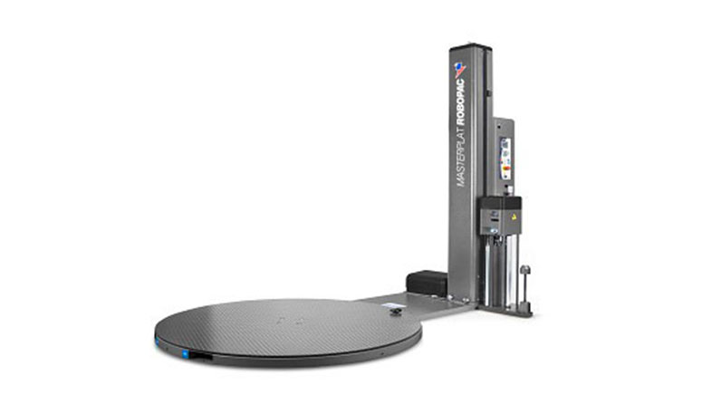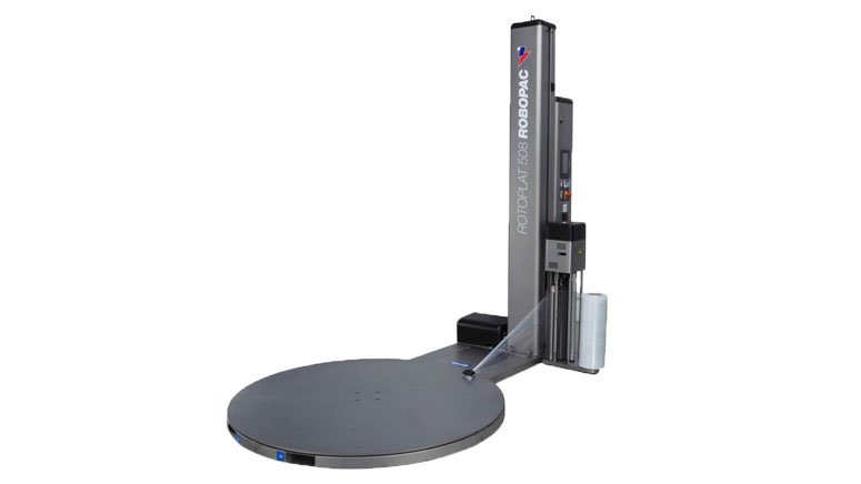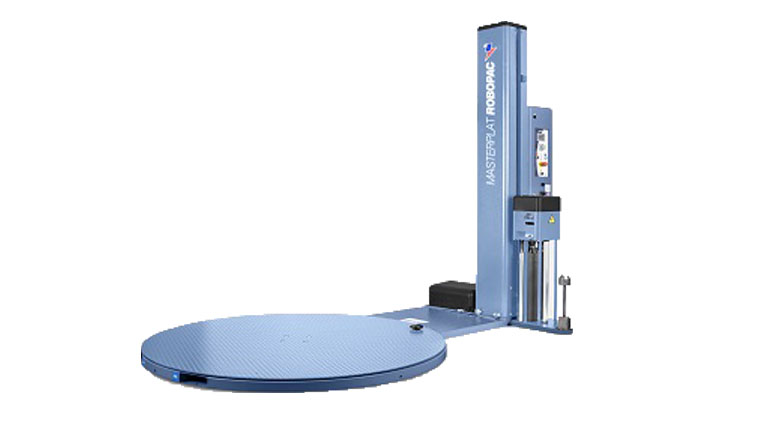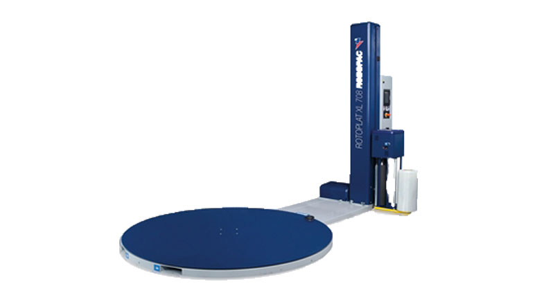 Halvautomatisk sträckfilmsmaskin med större vridbord för större pallar.